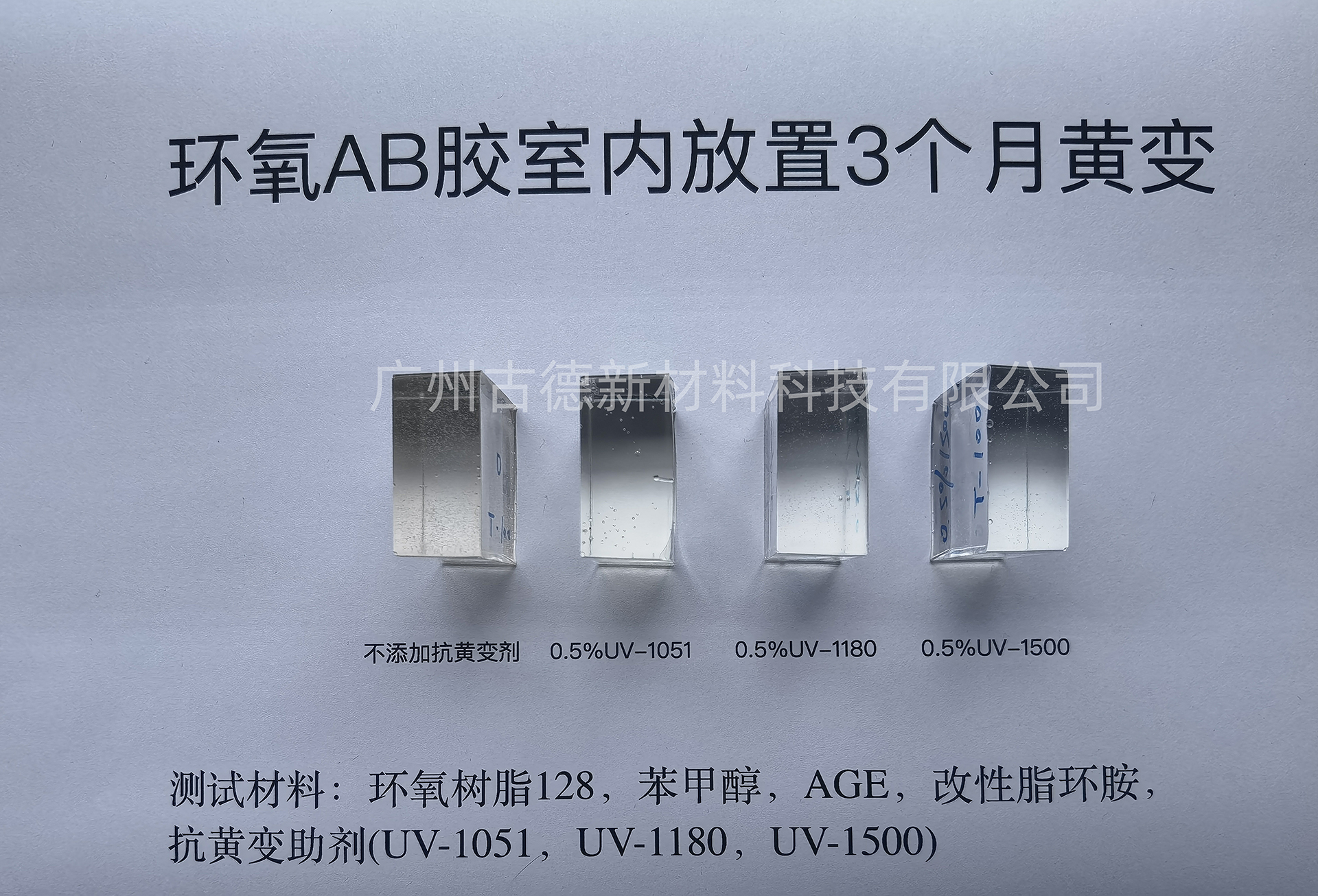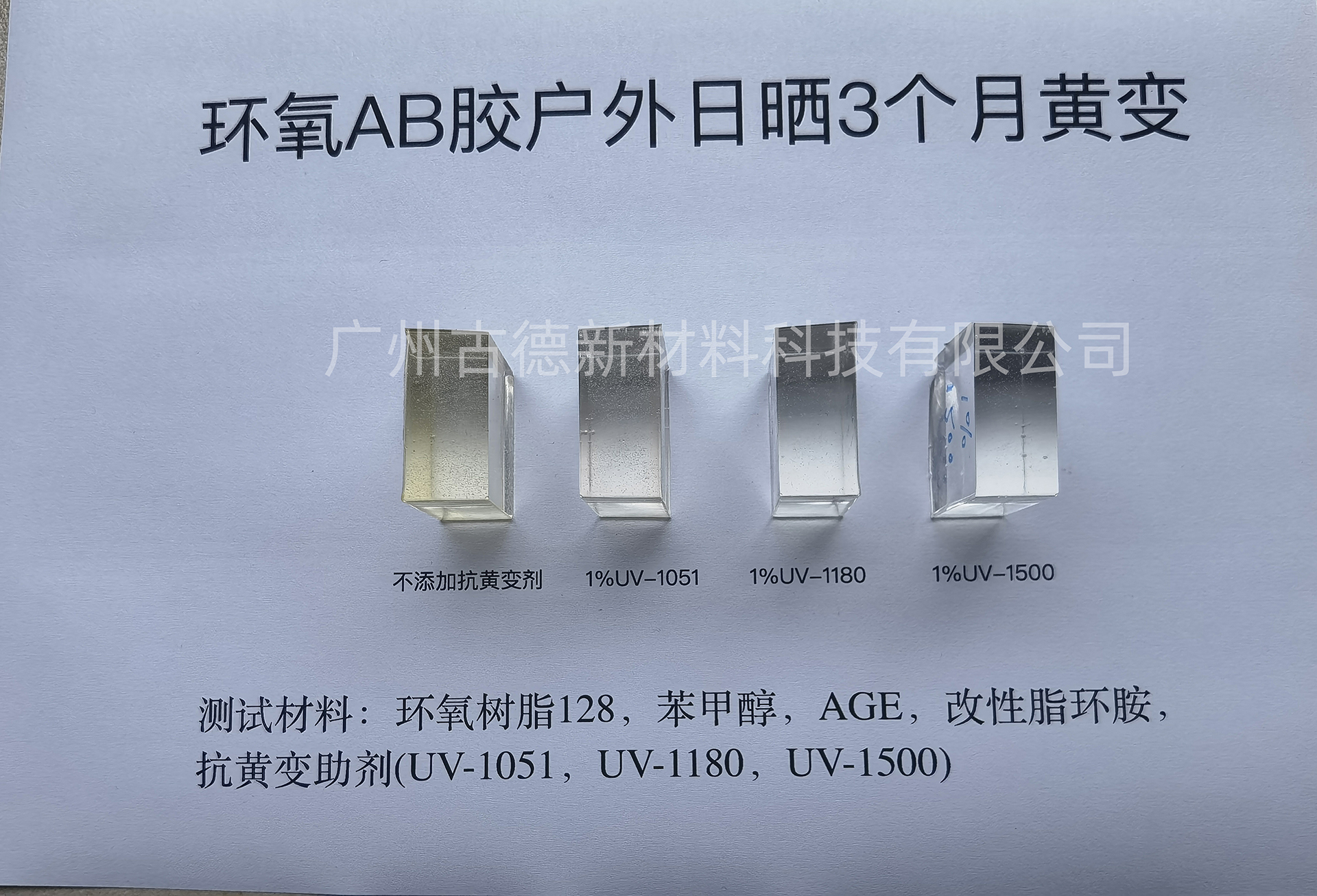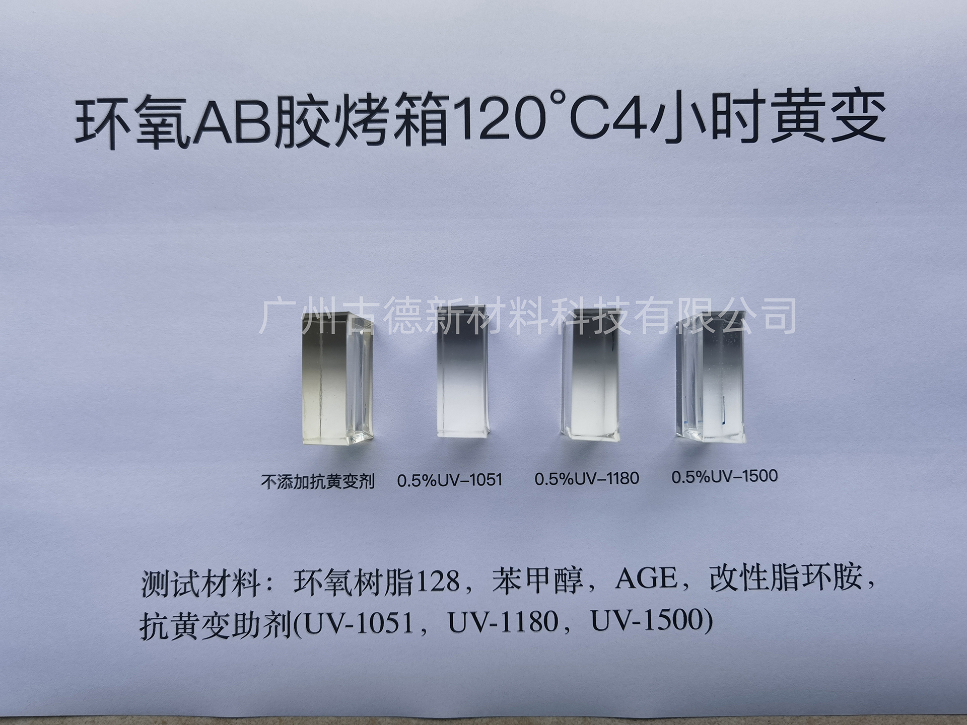 本文對古德新材料的UV-1051、UV-1180、UV-1500三款抗黃變助劑進(jìn)行環(huán)氧體系的黃變測試,分常溫室內(nèi)放置、烤箱高溫、戶外日曬三個場景進(jìn)行對比。